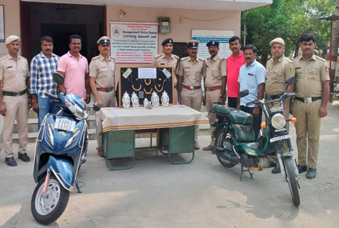 ಮಂಡ್ಯ ಜಿಲ್ಲೆಯ ವಿವಿಧ ದೇವಾಲಯಗಳಲ್ಲಿ ಭಕ್ತರ ಸೋಗಿನಲ್ಲಿ ಬಂದು ಲಕ್ಷಾಂತರ ರೂ. ವೌಲ್ಯದ ಚಿನ್ನಾಭರಣ ಲೂಟಿ ಮಾಡಿ ಪರಾರಿಯಾಗಿದ್ದ ಮೈಸೂರು ಮೂಲದ ಇಬ್ಬರು ಆರೋಪಿಗಳನ್ನು ಬಂಧಿಸುವಲ್ಲಿ ತಾಲೂಕಿನ ಬೆಸಗರಹಳ್ಳಿ ಪೊಲೀಸರು ಯಶಸ್ವಿಯಾಗಿದ್ದಾರೆ.