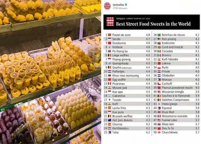 ದಕ್ಷಿಣ ಭಾರತದ ‘ಮೈಸೂರು ಪಾಕ್’ 14ನೇ ರ್ಯಾಂಕ್ನಲ್ಲಿದ್ದರೆ.. ‘ಕುಲ್ಫಿ’ 18ನೇ ಸ್ಥಾನ ಪಡೆದಿದೆ. ಈ ಪಟ್ಟಿಯಲ್ಲಿ ‘ಕುಲ್ಫಿ ಫಲೂಡಾ’ 32ನೇ ಸ್ಥಾನವನ್ನೂ ಪಡೆದುಕೊಂಡಿದೆ. ಮತ್ತು ಪೋರ್ಚುಗೀಸ್ ಎಗ್ ಕಸ್ಟರ್ಡ್ ಟಾರ್ಟ್ ‘ಪಾಸ್ಟಲ್ ಡಿ ನಾಟಾ’ ವಿಶ್ವದ ಅತ್ಯುತ್ತಮ ಬೀದಿ ಆಹಾರ ಸಿಹಿಯಾಗಿ ನಂಬರ್ ಒನ್ ಸ್ಥಾನದಲ್ಲಿದೆ.