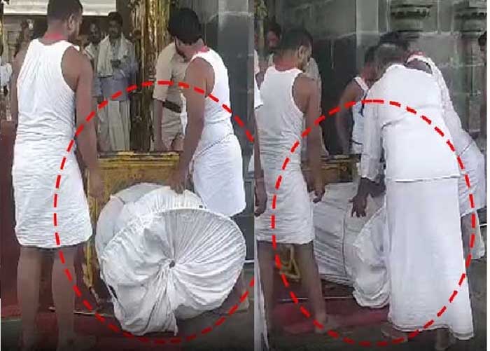 ತಿರುಮಲದ ಶ್ರೀ ವೆಂಕಟೇಶ್ವರ ಸ್ವಾಮಿ ದೇವಸ್ಥಾನದ ಮಹಾದ್ವಾರದಲ್ಲಿ ಸ್ವಾಮಿಯ ಹುಂಡಿ ಬಿದ್ದಿದೆ. ಶ್ರೀವಾರಿ ಹುಂಡಿಯನ್ನು ಲಾರಿಯಲ್ಲಿ ದೇವಸ್ಥಾನದಿಂದ ಪರಕಾಮಣಿ ಮಂಟಪಕ್ಕೆ ತರುತ್ತಿದ್ದಾಗ ಈ ಘಟನೆ ನಡೆದಿದೆ. ಇದರಿಂದ ಹುಂಡಿಯಿಂದ ಕಾಣಿಕೆಗಳು ಬಿದ್ದಿವೆ. ತಕ್ಷಣ ಎಚ್ಚೆತ್ತ ಸಿಬ್ಬಂದಿ ಎಚ್ಚರಿಕೆಯಿಂದ ಲಾರಿಗೆ ತುಂಬಿದರು. ಸಿಬ್ಬಂದಿ ನಿರ್ಲಕ್ಷ್ಯದಿಂದ ಹುಂಡಿ ಬಿದ್ದಿದೆ ಎಂದು ಟಿಟಿಡಿ ಅಧಿಕಾರಿಗಳು ಆಕ್ರೋಶ ವ್ಯಕ್ತಪಡಿಸಿದರು.
