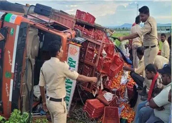 ಕರ್ನಾಟಕದ ಚಿಂತಾಮಣಿಯಿಂದ ಮಹಾರಾಷ್ಟ್ರದ ಚಂದ್ರಾಪುರಕ್ಕೆ ಲೋಡ್ ತುಂಬಿಕೊಂಡು ಬರುತ್ತಿದ್ದ ಲಾರಿಯೊಂದು ಎದುರಿನಿಂದ ಬರುತ್ತಿದ್ದ ವಾಹನವನ್ನು ತಪ್ಪಿಸುವ ಭರದಲ್ಲಿ ಪಲ್ಟಿಯಾಗಿದೆ. ಲಾರಿಯಲ್ಲಿ ಸಿಲುಕಿದ್ದ ಚಾಲಕನನ್ನು ಸ್ಥಳೀಯರು ಹೊರತೆಗೆದಿದ್ದಾರೆ. ಅಪಘಾತದಿಂದ ಸಣ್ಣಪುಟ್ಟ ಗಾಯಗಳಿಂದ ಹೊರಗೆ ಬಂದೆ ಆದರೆ, ಆ ಲಾರಿಯಲ್ಲಿ ರೂ.11 ಲಕ್ಷ ಮೌಲ್ಯದ ಟೊಮ್ಯಾಟೋ ಇತ್ತು ಎಂದು ಚಾಲಕ ಹೇಳಿದ್ದಾನೆ.