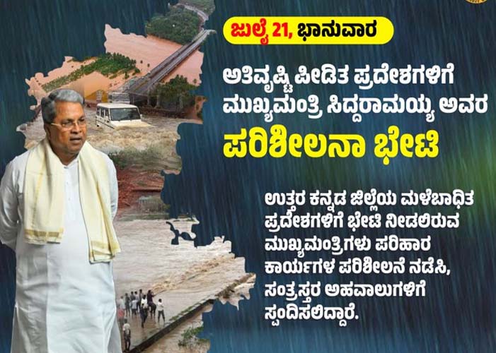 ಈ ಕುರಿತಾಗಿ ಮುಖ್ಯಮಂತ್ರಿ ಸಿದ್ದರಾಮಯ್ಯ ಅವರು ಸಾಮಾಜಿಕ ಜಾಲತಾಣ ಎಕ್ಸ್ ನಲ್ಲಿ ಪೋಸ್ಟ್ ಮಾಡಿದ್ದು, ಕಳೆದ ಕೆಲವು ದಿನಗಳಿಂದ ಎಡಬಿಡದೆ ಸುರಿಯುತ್ತಿರುವ ಮಳೆಯಿಂದಾಗಿ ಅತಿಹೆಚ್ಚು ಹಾನಿಗೆ ಒಳಗಾದ ಉತ್ತರ ಕನ್ನಡ ಜಿಲ್ಲೆಯ ಆಯ್ದ ಸ್ಥಳಗಳಿಗೆ ನಾಳೆ ಭೇಟಿ ನೀಡಿ, ಪರಿಹಾರ ಕಾರ್ಯದ ಪರಿಶೀಲನೆ ನಡೆಸಿ, ಸಂತ್ರಸ್ತರ ಅಹವಾಲುಗಳನ್ನು ಆಲಿಸಲಿದ್ದೇನೆ.