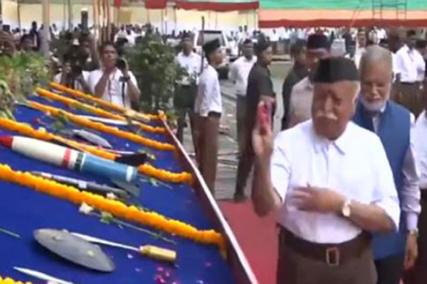 RSS ಸರಸಂಘ ಚಾಲಕ ಮೋಹನ್ ಭಾಗವತ್ ಅವರು ವಿಜಯದಶಮಿ ನಿಮಿತ್ತ ನಾಗಪುರದ ಆರ್ಎಸ್ಎಸ್ ಕೇಂದ್ರ ಕಚೇರಿಯಲ್ಲಿ ಶನಿವಾರ ‘ಶಸ್ತ್ರ ಪೂಜೆ’ ನೆರವೇರಿಸಿದರು.