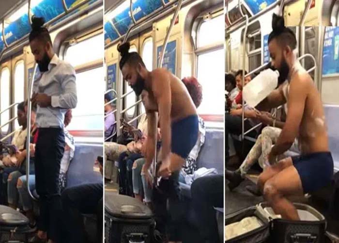 ಈ ಆಘಾತಕಾರಿ ಘಟನೆ ನಡೆದಿರುವುದು ನಮ್ಮ ದೇಶದಲ್ಲಿ ಅಲ್ಲ, ನ್ಯೂಯಾರ್ಕ್ ನಗರದಲ್ಲಿ. ನ್ಯೂಯಾರ್ಕ್ ನಗರದ ಸುರಂಗಮಾರ್ಗ ರೈಲಿನಲ್ಲಿ ಈ ಘಟನೆ ಬೆಳಕಿಗೆ ಬಂದಿದೆ. ಎಲ್ಲಾ ಪ್ರಯಾಣಿಕರೆದುರು ಸೀಟ್‌ನಿಂದ ಎದ್ದ ವ್ಯಕ್ತಿ ಎಲ್ಲರೂ ನೋಡುತ್ತಿರುವಾಗಲೇ, ಶೂ ತೆಗೆದು ಬಟ್ಟೆ ಬಿಚ್ಚಿ ಸೂಟ್‌ಕೇಸ್‌ನಂತಿದ್ದ ಟ್ರಾಲಿ ಬ್ಯಾಗ್‌ ತೆರೆದು ನೀರಿನ ಬಾಟಲಿಯಿಂದ ಸ್ನಾನ ಮಾಡಿದ್ದಾನೆ. ಸೋಪು, ಶಾಂಪೂ ಬಳಸಿ ಒಂದು ಹನಿ ನೀರೂ ಹೊಹೋಗದಂತೆ ಅಚ್ಚುಕಟ್ಟಾಗಿ ಸ್ನಾನ ಮಾಡಿದ್ದಾನೆ.