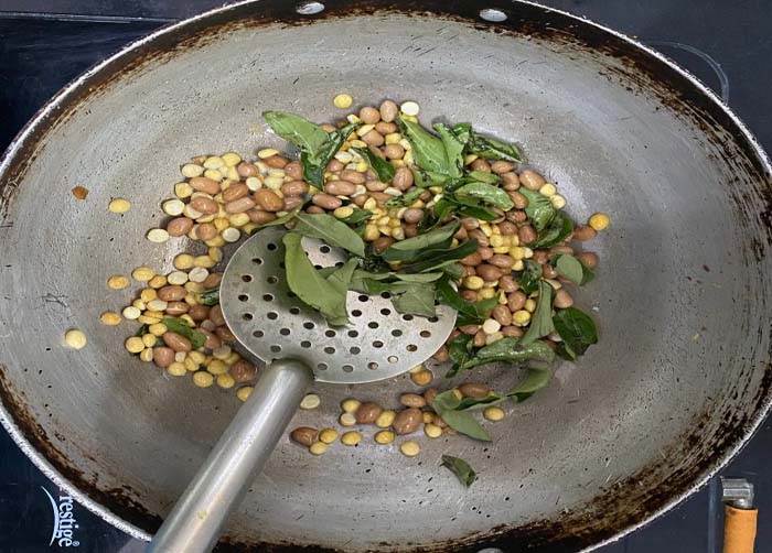 ನಂತರ ಕಡ್ಲೆಬೇಳೆ ಹಾಗೂ ಉದ್ದಿನಬೇಳೆ ಹಾಕಿಕೊಂಡು ಡ್ರೈ ರೋಸ್ಟ್ ಮಾಡಿ